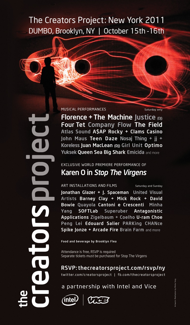 Note: October 15th will feature all music performances and avails with artists, musicians and designers, starting at noon and stretching throughout the day. Please submit all media requests to media at thecreatorsproject.com<mailto:media at thecreatorsproject.com> or hit me back on this email!