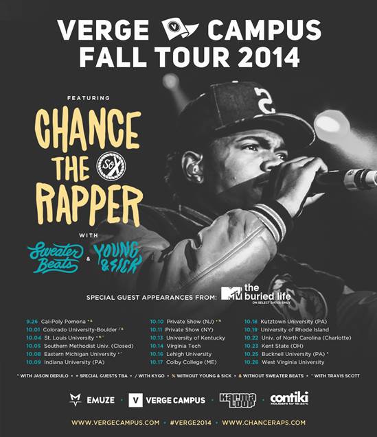 BOSTON, MA - September 2nd, 2014 - The Verge Campus Tour <mailto:www.VergeCampusTour.com> is once again set to take U.S. colleges and universities by storm this Fall and will feature Chance The Rapper, one of hip-hop's most exciting voices and whom Billboard claimed "won Lollapalooza" earlier this month. After yet another successful Spring Tour this past April with Krewella, Logic and Radical Something, the Verge Campus Fall Tour will kick off September 26th at Cal Poly Pomona. Joining Chance The Rapper on the nationwide trek will be LA-based music and art project Young & Sick and Sweater Beats, a producer/DJ who creates dream-soaked pop and lush R&B. Past Verge Campus Tours have completely sold out. Tickets for most shows will be open to both students and the general public and the full list of tour dates is below. Stay tuned to www.VergeCampusTour.com<http://www.VergeCampusTour.com> for ticket information in the coming weeks.