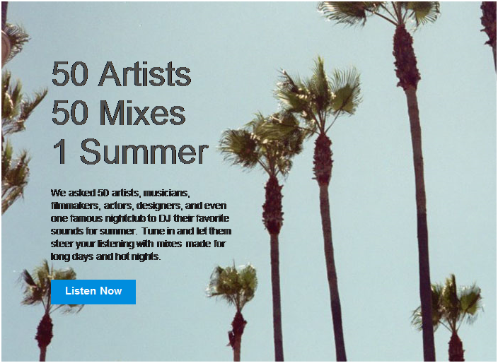 [Text Box: 50 Artists 50 Mixes 1 Summer We asked 50 artists, musicians, filmmakers, actors, designers, and even one famous nightclub to DJ their favorite sounds for summer. Tune in and let them steer your listening with mixes made for long days and hot nights. Listen Now]