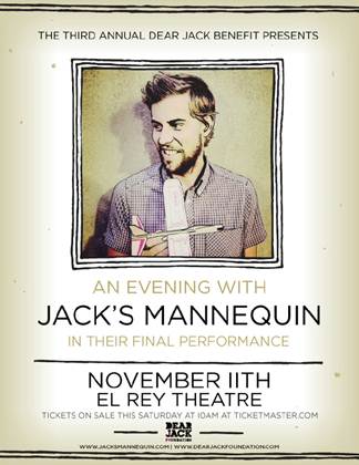 Acclaimed California rock band Jack's Mannequin will be playing their final show on November 11th at the El Rey Theatre. The show, which will feature special guests, will benefit Jack's Mannequin singer/pianist Andrew McMahon's charity - THE DEAR JACK FOUNDATION. A pre-sale for tickets will begin today at 12 pm PST for this show; press HERE<http://tixx1.artistarena.com/dearjackbenefit/> to buy tickets via the pre-sale. Tickets will be on sale to the general public on September 15th at 10 am PST.