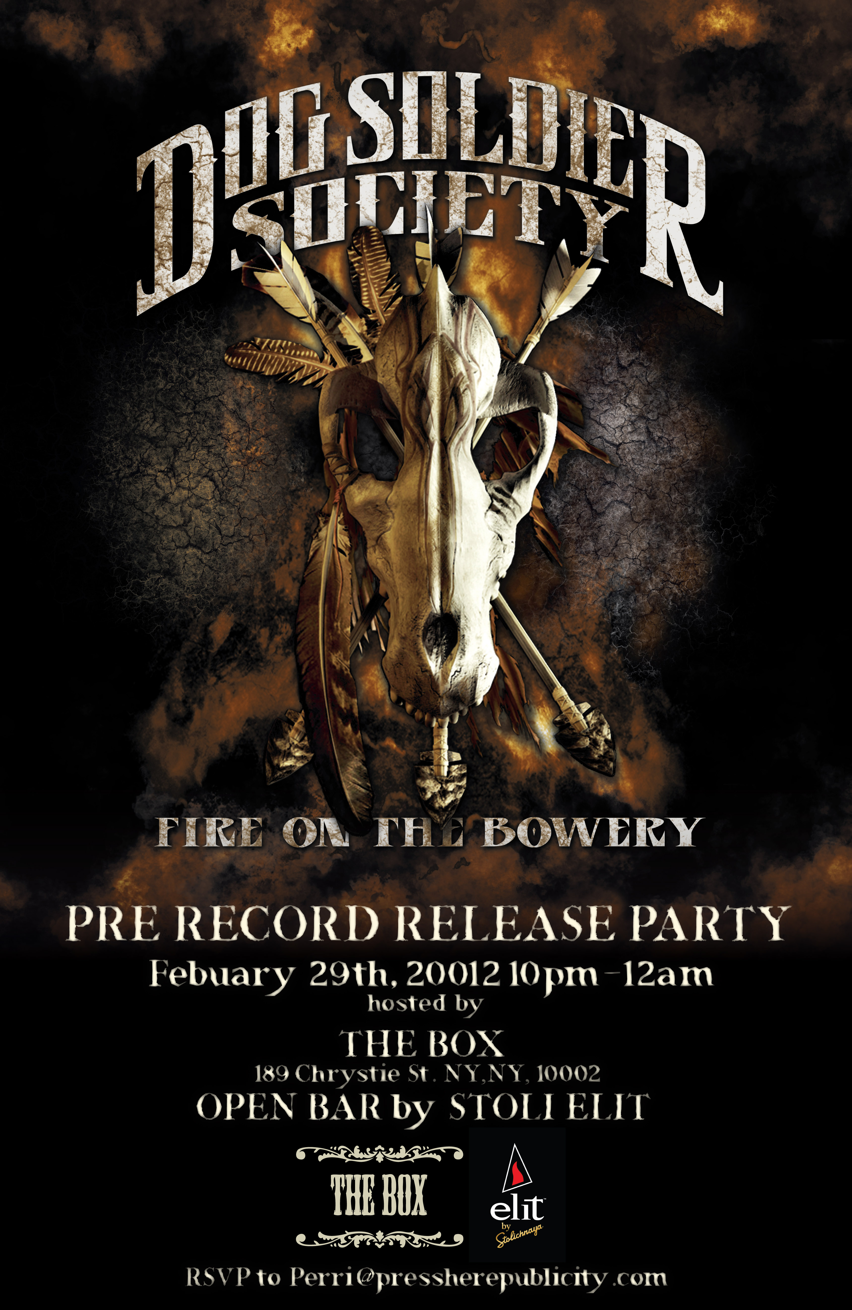 Dog Soldier Society's influences include The Misfits, Jim Morrison, The Stooges, Ginger Baker, Steppenwolf and "Raging." Their upcoming debut, Fire On The Bowery, was recorded and mixed in twelve days, creating a gem that sucker punches its listeners with the real deal, old school rock missing of late in the N-Y-C. Dog Soldier already played the launch party for the re-released film The Warriors in Tompkins Square Park and headlined the Hell's Angels annual invitational for the New York City chapter local 81 -- Now it's your turn to come hear them at The Box - hit me back and we'll get you one of the fancy booths! Open bar by Stoli Elit and it looks like Chef Roeble (from Bravo) is catering. I've attached an invite for you here. Represent!! Don't let The Dog Soldier down!! They are artists, rockers and huggers!