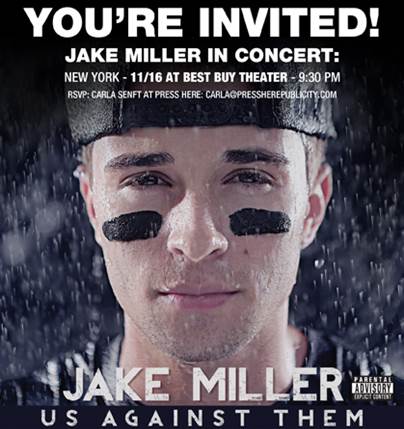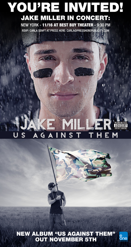 [cid:image004.jpg at 01CEDEF3.BE5BF5C0]Please let us know if you can join us as Jake Miller brings his 43-date 'Us Against Them' tour to NYC on Saturday at Best Buy Theater. Jake's hip-pop album Us Against Them debuted last week at #3 on the iTunes Hip-Hop Chart, behind only Eminem and in the Top 10 on the iTunes Albums Chart overall. Single "Collide" is heating up at Top 40 radio - PRESS HERE<http://www.youtube.com/watch?v=Ofc6dRyAqbM> to watch the video. PRESS HERE<http://www.youtube.com/watch?v=449PbJznC_Q> to check out Episode 1 of Jake's tour video series. Earlier this year his EP The Road Less Traveled debuted at #1 on the iTunes Hip-Hop Chart and spawned his hit single and video "A Million Lives"<https://www.youtube.com/watch?v=oGGs65J3UEA>.