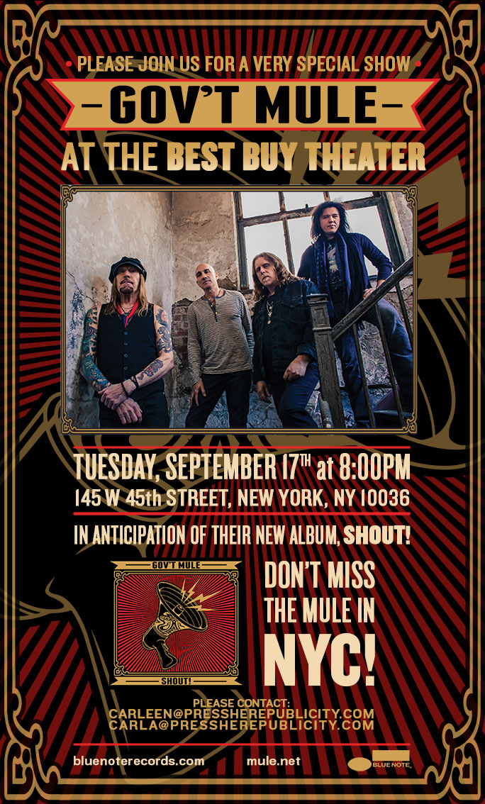 Rock torchbearers Gov't Mule are playing a special NYC show at Best Buy Theater on Sept 17th at 8pm. Please let us know if you can join us for this epic night of music which will feature songs from the new star-studded, double-disc album, Shout!, out September 24th on Blue Note Records!