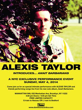 Alexis Taylor is performing a special free solo show in New York City on Sunday, May 4th. The intimate event will take place at Manhattan Inn at 4:30pm where Taylor will debut tracks from his upcoming album Await Barbarians (Domino) - out on June 17th.