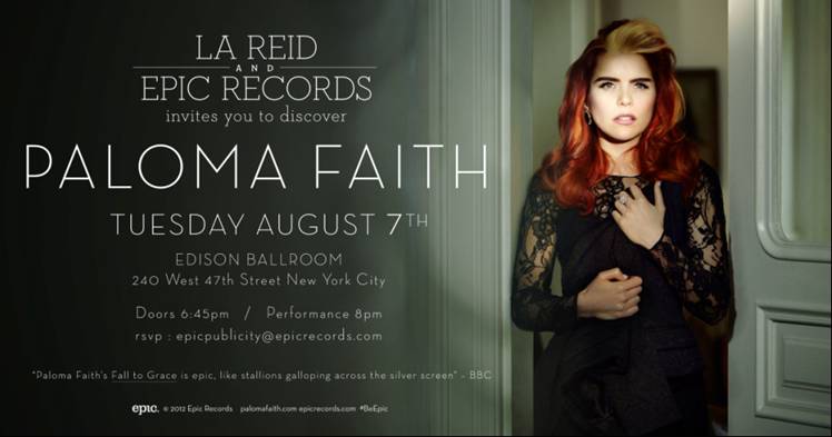 While Paloma made the trek in her heels without a misstep, the UK press is falling all over themselves praising Fall To Grace. Mojo raves, "she sings the bejesus out of these big, open-hearted tunes;" The Sun dubs Faith "compellingly unique;" and The Times praises her "big, hook-laden pop tunes." Produced by Nellee Hooper (Bjork, No Doubt, Massive Attack, Madonna) along with Jake Gosling (Ed Sheeran), Fall To Grace is full of Faith's bluesy power and husky emotion and will mark Paloma Faith's first official US release when the album is out on Epic Records in November 2012. Until then, hear "30 Minute Love Affair" HERE<http://www.youtube.com/watch?v=-A-BO1PAEdU>.