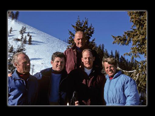 (L to R) Willy Schaeffler (coach of the US Olympic Ski Team), Ted Kennedy, John Glenn, Jim, Robert Kennedy - in Sun Valley, about 1966. - Whittaker family collection
