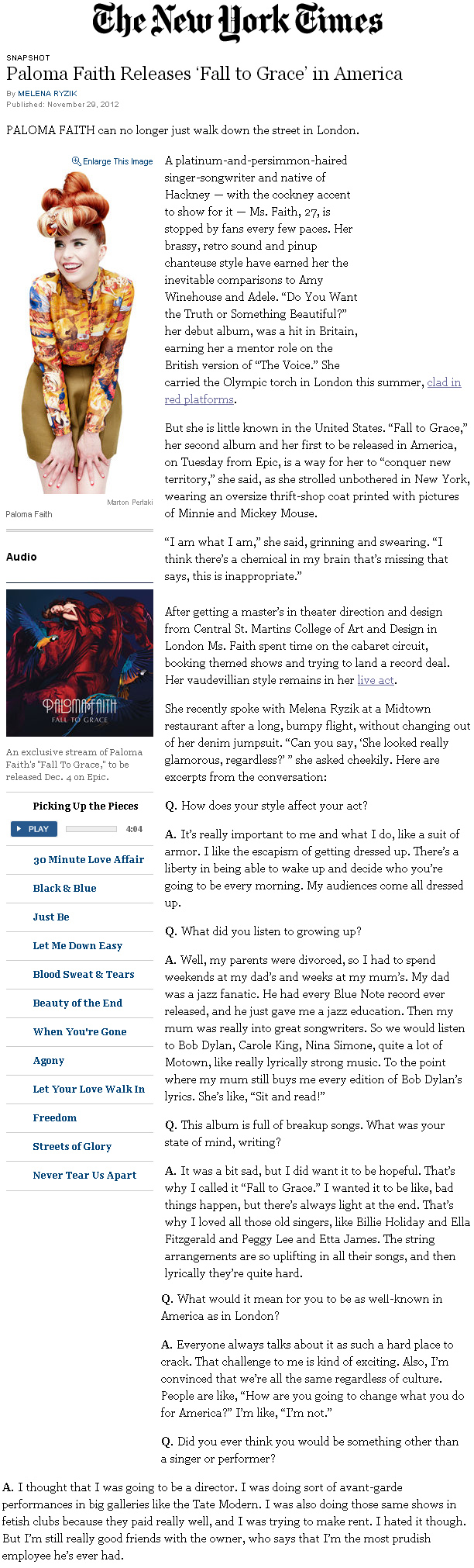 Paloma Faith's upcoming US debut Fall To Grace (Epic Records) is now streaming in its entirely exclusively on The New York Times. PRESS HERE<http://www.nytimes.com/2012/12/02/arts/music/paloma-faith-releases-fall-to-grace-in-america.html> to listen to the album now before it is out officially on December 4th.