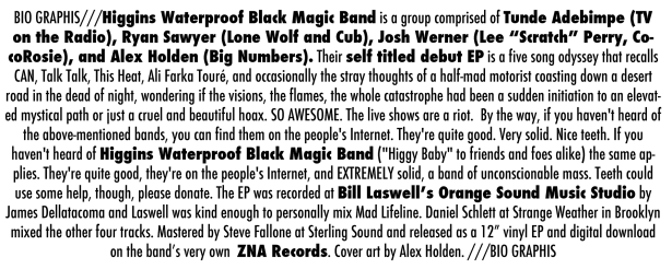 Higgins Waterproof Black Magic Band marries shoegaze guitar to post-punk rhythms and dub bass and vocal effects. The effect is moody but undeniably groovy. Lead single "The Blast, The Boom" is explosive and immediate. Tracks like "Knocking Ghost" evoke Fugazi at their most atmospheric, while epic album closer "Mad Lifeline" stacks mountains of delay on top of West African rhythms until the tension nearly snaps. - Afropunk