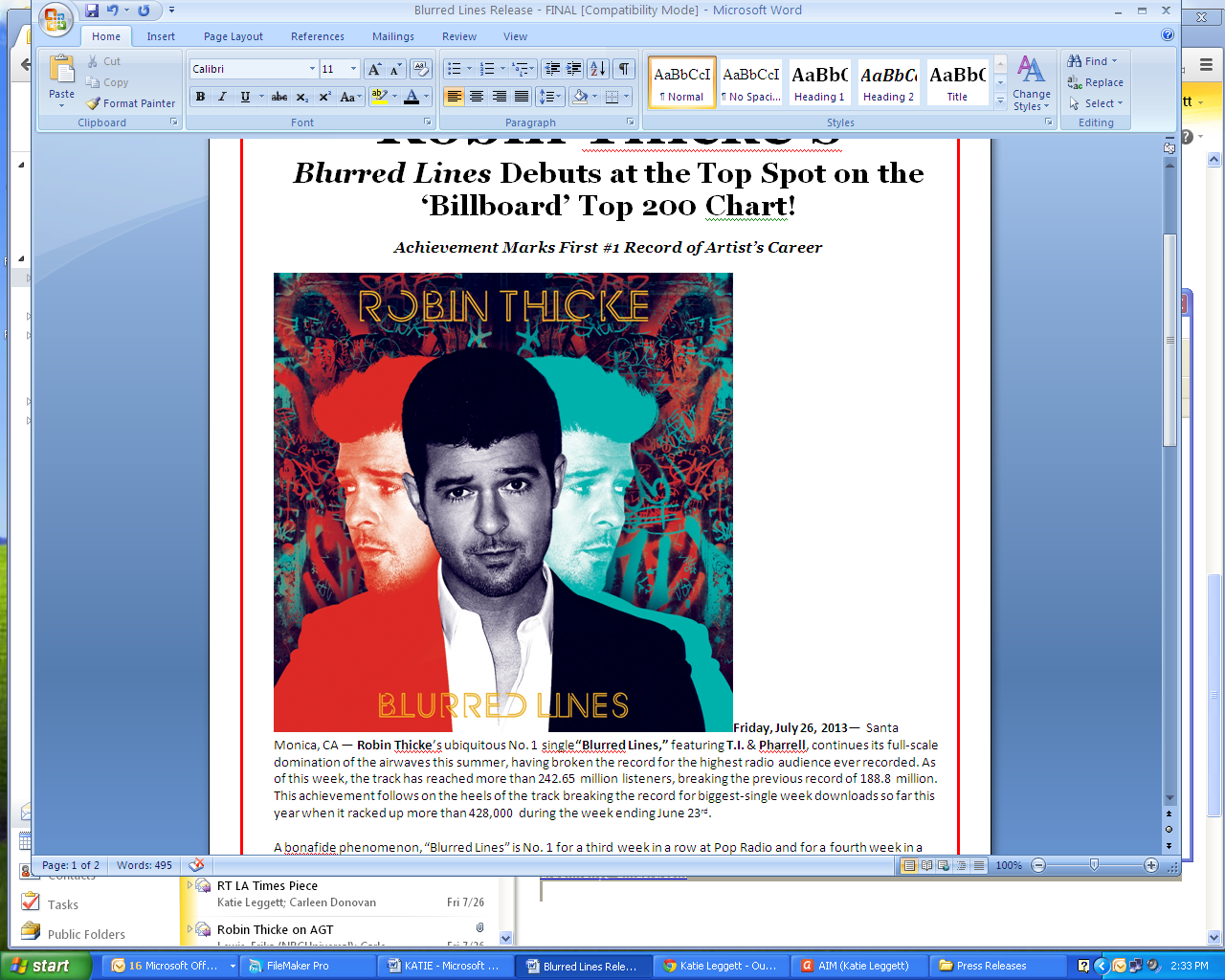 [cid:image002.jpg at 01CE9366.18D8ED20]August 7, 2013 -- Robin Thicke's sixth studio album, Blurred Lines, (Star Trak/Interscope Records) has claimed the top spot on the Billboard Top 200 album chart. With this achievement, Robin is celebrating the first #1 record of his career. The artist reached another milestone this week when Blurred Lines sold more than 170,000 units- Robin's biggest week of sales ever. The collection's title track and No. 1 hit , featuring T.I. & Pharrell, also continues its full-scale domination of the airwaves with more than 400,000 singles sold this past week. Earlier this month, the track broke the record for the highest radio audience ever recorded. This follows on the heels of the hit breaking the record for biggest-single week downloads so far this year when it racked up more than 428,000 during the week ending June 23rd.
