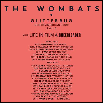On the heels of a sold-out UK and Australian tour, the Liverpool trio will kick-off their North American Spring tour on April 21st in Toronto with LIFE IN FILM and labelmates Cheerleader supporting. The tour run will bring The Wombats through New York City, Boston, Los Angeles, Seattle, San Francisco and more, plus the band will make an appearance at this year’s Lollapalooza. All Spring 2015 tour dates listed below.