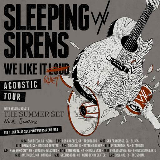 Sleeping With Sirens, fronted by Kellin Quinn, released their new record Madness last month via Epitaph Records and dominated the Billboard Top 200, as well as the iTunes Charts with the #1 Top Rock Album, 5 different songs in the Top 10 Rock Songs chart, and a Top 10 Album slot in all genres. Now, during the sold-out European leg of their massive World Tour with Pierce The Veil, Sleeping With Sirens have announced the "We Like It Quiet" Tour, an acoustic run of shows this Summer with support from The Summer Set and Nick Santino. Sleeping With Sirens have consistently sold-out tours since 2012 with over 80k tickets sold on The World Tour, so see below for full tour routing, and be sure to get your tickets before they are gone! Tickets will be on-sale today at 2 pm EST at sleepingwithsirens.net<http://sleepingwithsirens.net>
